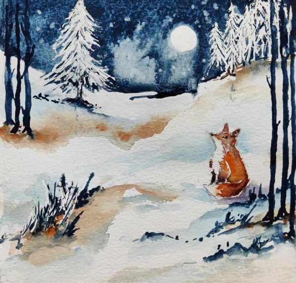 At the heart of this workshop is a story: a lone fox, its fiery coat glowing under the silver light of a full moon, sitting still in a quiet glade. The night sky stretches above, deep and endless, scattered with stars. This image—mysterious, serene, and wild—is the muse for our evening of watercolor exploration.